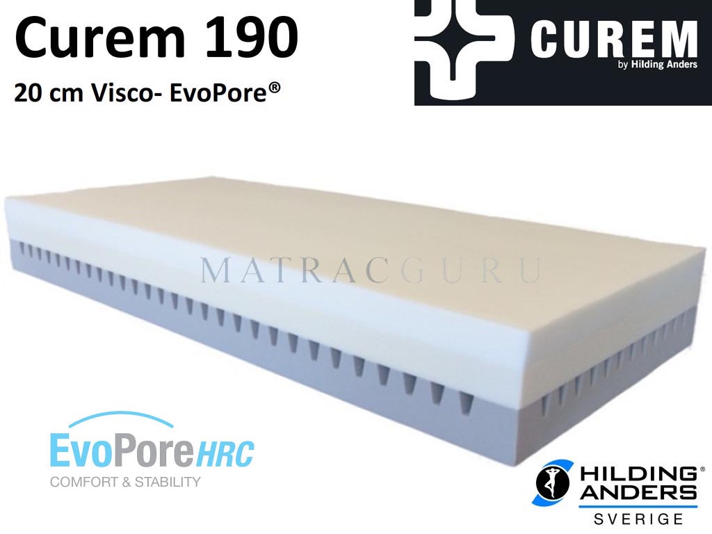 Az eredetileg svájci Curem márka a luxus memoryfoam matrac egyik szimbóluma lett. Curem matracok, így Curem 1900 EvoPure® MemoryFoam matrac is a svéd Hilding Anders óriásvállalat gondozásában készülő matracok. Curem 1900 matrac a tökéletes luxus és az elfogadható ár egyensúlya. A speciális összetételű és nyitott cellaszerkezetű, egyedülállóan légáteresztő EvoPure® memoryfoam habanyaggal készülő Curem 1900 matracok a luxus memoryfoam matracokat képviselik. A nagy tömegsűrűségű és levegőcsatornákkal kialakított alsó tartómag felett két különböző sűrűségű és keménységű légáteresztő EvoPure® memoryfoam réteg olyan kivételes komfortot nyújt, amit csak a csúcskategóriás, luxus matracoknál tapasztalunk. EvoPore® a legújabb fejlesztésű, kevert cellaszerkezetes matracipari alapanyag, amely a tesztek szerinte 40%-kal pontrugalmasabb, formakövetőbb, mint a minőségi nagyrugalmasságú eddig megszokott felsőkategóriás hideghabok.